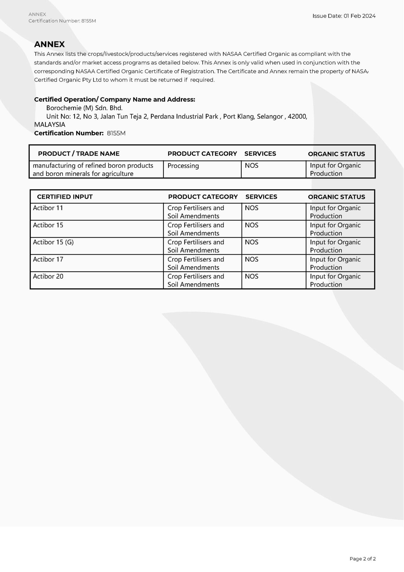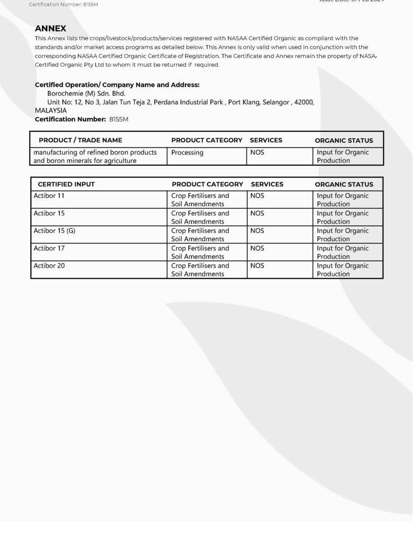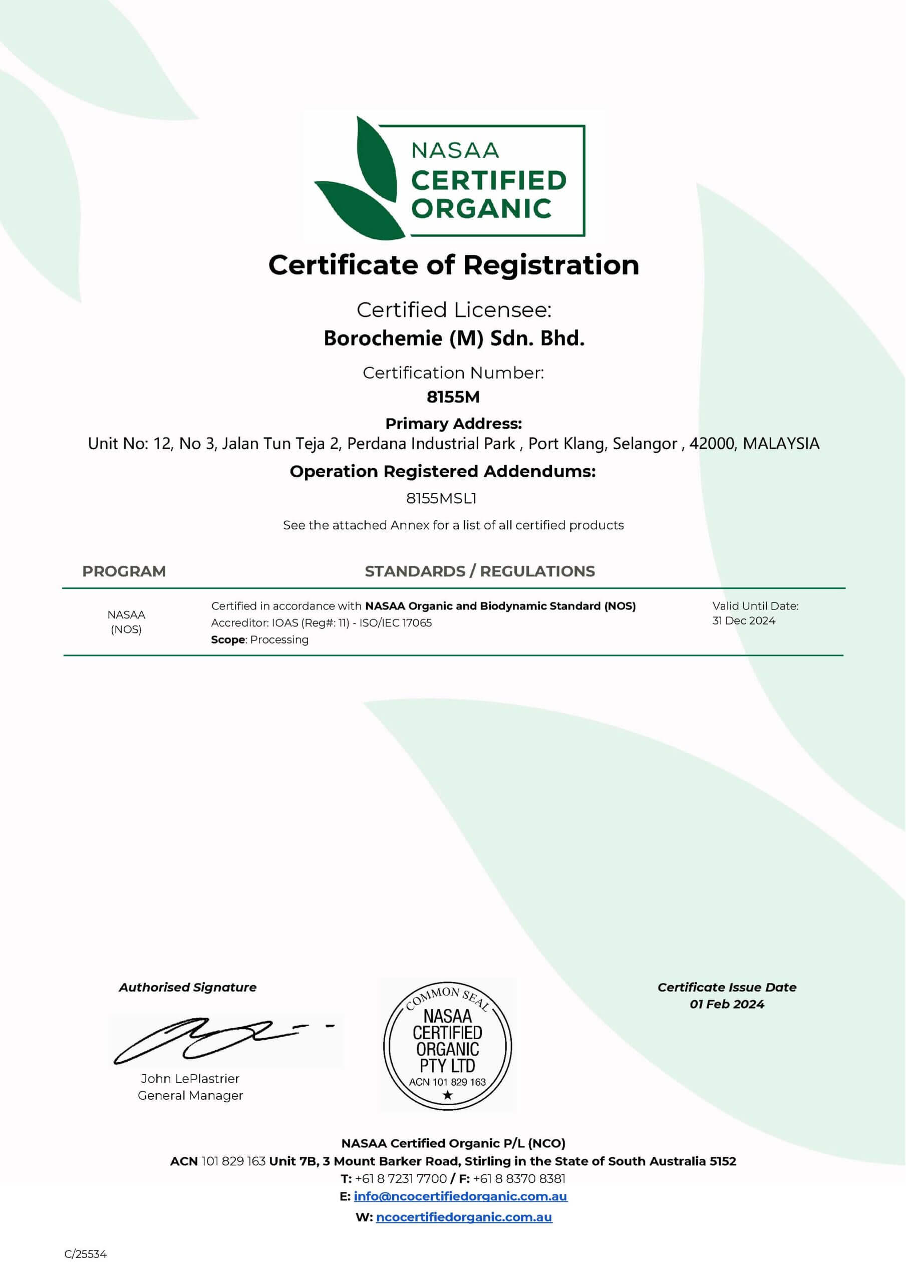 Borochemie ensures that all products sourced from our principals have undergone rigorous audits and certifications by independent third parties. These certifications include international standards like ISO, Halal, and Kosher, and extend to organic agriculture with NASAA certification from Australia for our Actibor products.