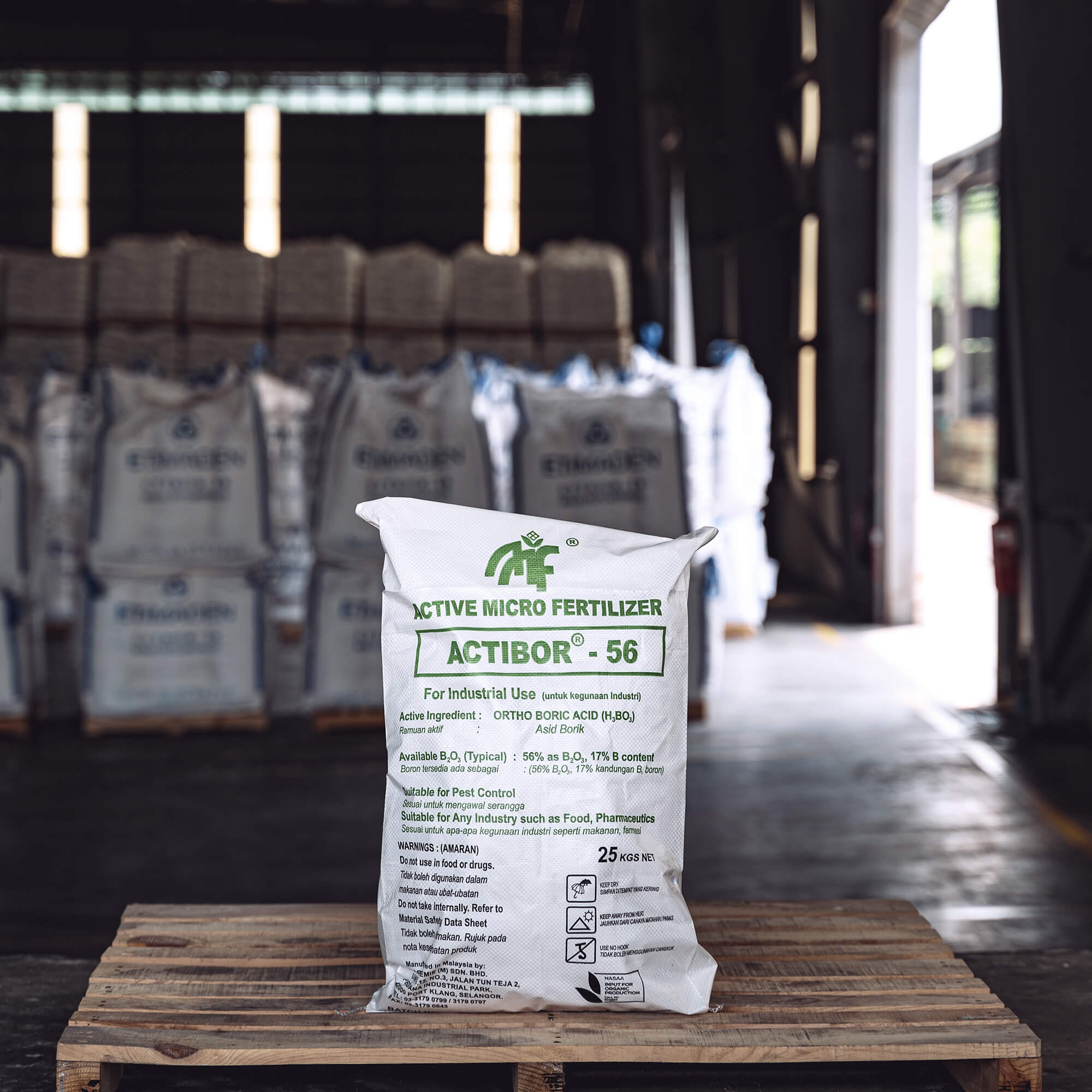 Actibor 56 is high-purity boric acid (H₃BO₃), a versatile compound used across industries. Produced by reacting borax with mineral acids, it forms colorless crystals or white powder, ideal for various applications.