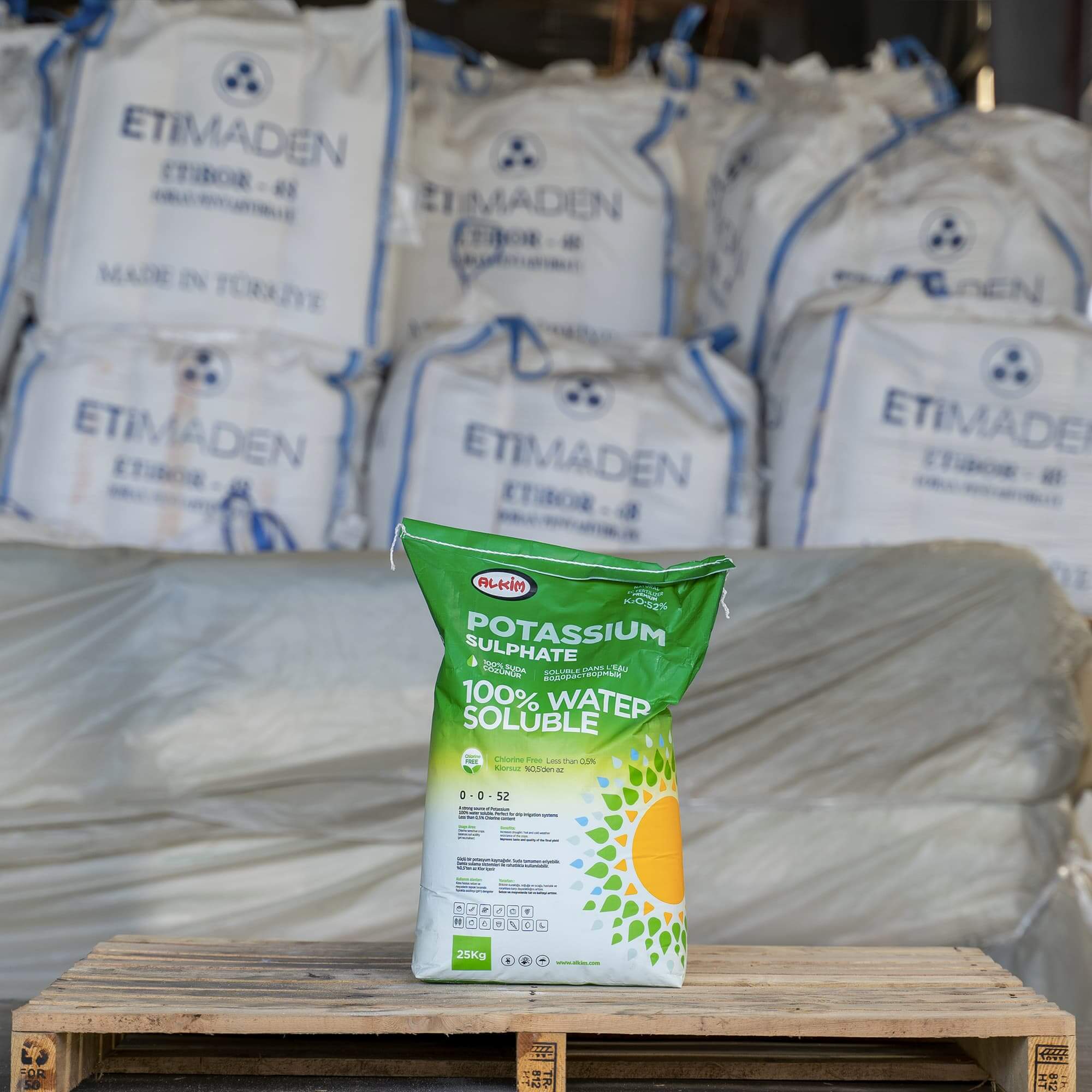 This is a natural product with very high purity and K2O content. It contains almost zero chlorine and has no heavy metals. The product has no acidity and is neutral with a pH of 7. Additionally, it is 100% water soluble and EKOTAR certified. It is ideal for organic farming and fertigation.